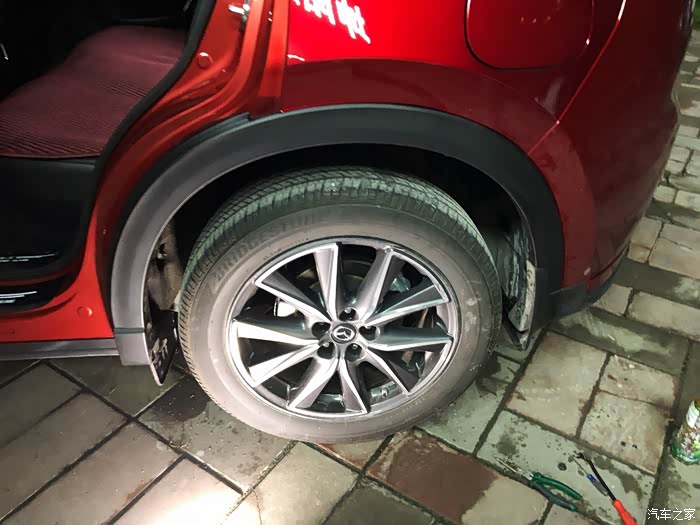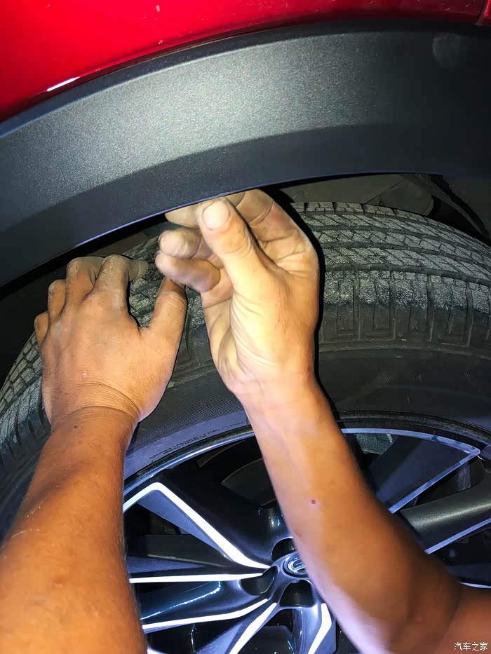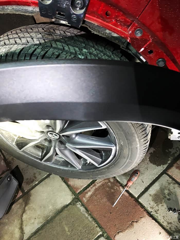 找了楼下洗车店老板,拆卸方法很简单,先拆原车最底端两边的挡泥板四个(还是6个来着忘了拍了)塑料卡钉,然后沿着一边往外拔,建议把后门打开,方便操作。轮眉拆卸尽量沿着一个方向从下往上拆,拆到轮眉最顶端,那有个暗扣卡子,换另一个方向从下往上拆。