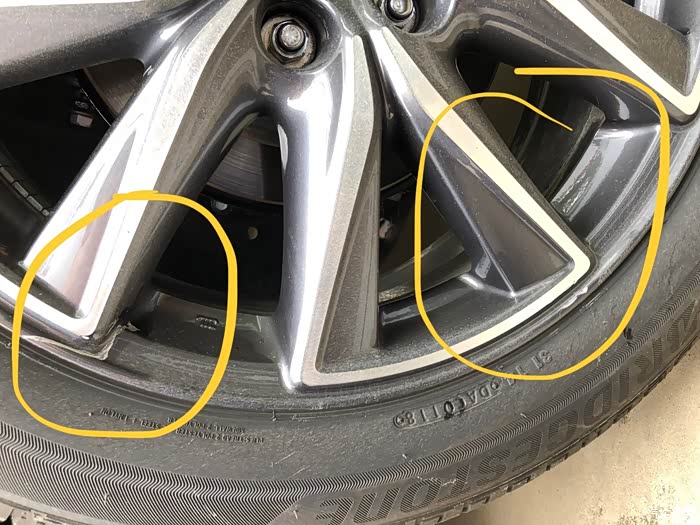 左后轮毂刮花两处,2.5双色轮毂一般修理厂问了无法处理
