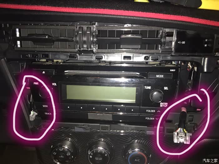 面板掉了以后还要拔掉雷达(右边红圈)和双闪按钮(左边红圈)的连接线。最好顺带把双闪按钮和雷达那个小灯也取下来,放好,一会儿要用。拆完收音机的装饰面板以后就是这样了。