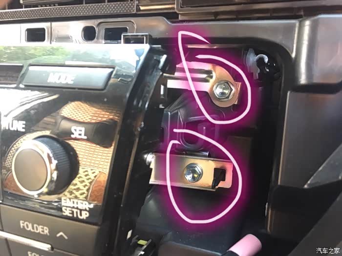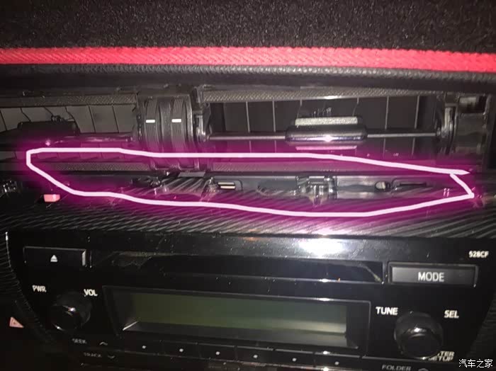 收音机就这样,然后拆收音机装饰板。圈住的地方就是装饰板的卡扣,从这里开始往外拔,不费劲。然后在慢慢把下面四周的卡扣拔出来,记不清了,总共好像是6个卡扣。也是注意力度,比较不好拔,弄的手疼。