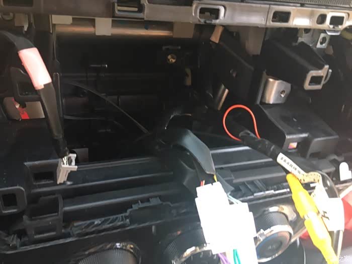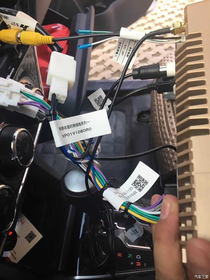 拔出来以后就这样,几根线头。和车机对应连接就行,每根线上都挂的有标签和说明。倒车影像摄像头还用的原来的,接口通用,照片里黄线就是倒车影像,黄线边上的细红线是倒车检测,也要和车机上的倒车检测线连上。