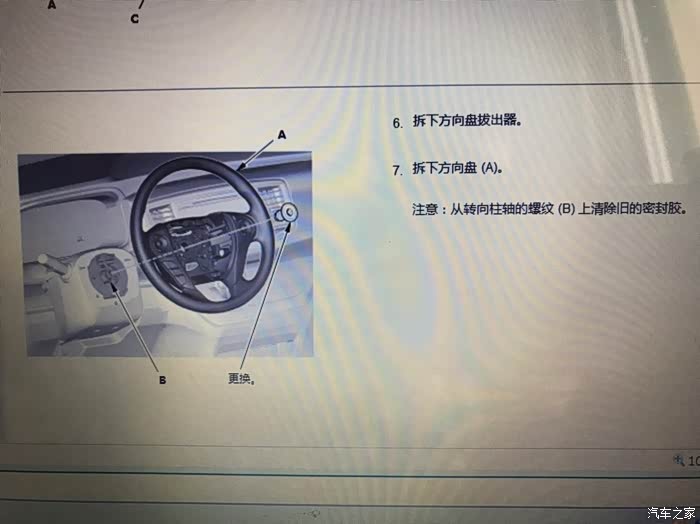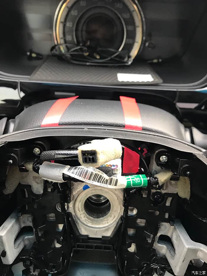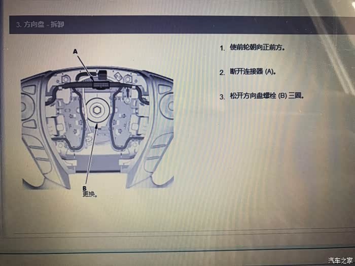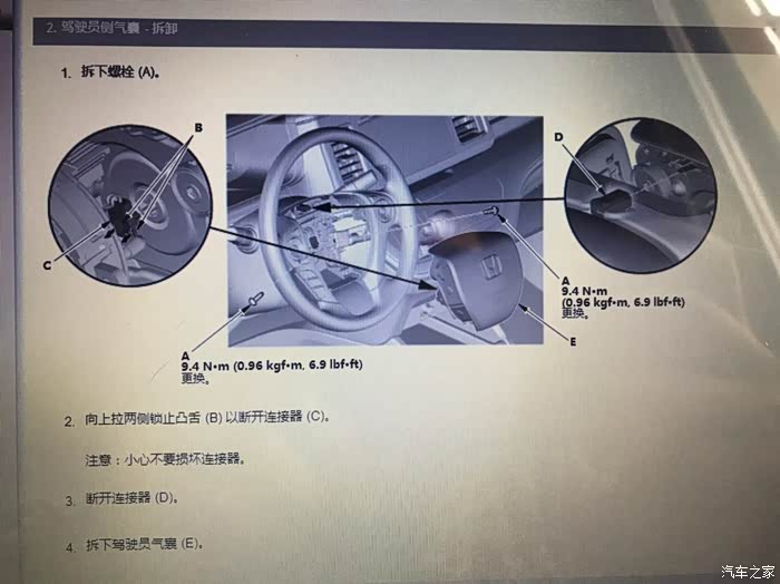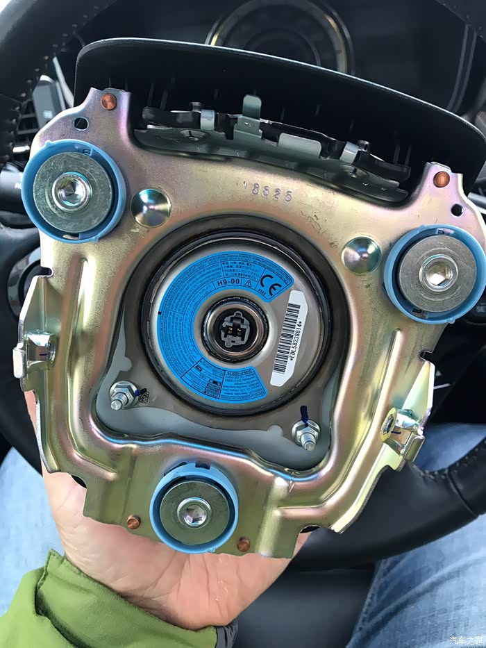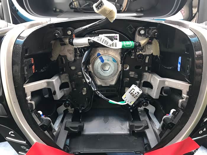 气囊反面,按照官方图解拆气囊需要断开电瓶负极的,我没有断开,直接拔的,但是还是要注意点??,拔气囊时面不要对着人就好,拆下来放的时候,把气囊面朝上放,切记!安全还是第一的!