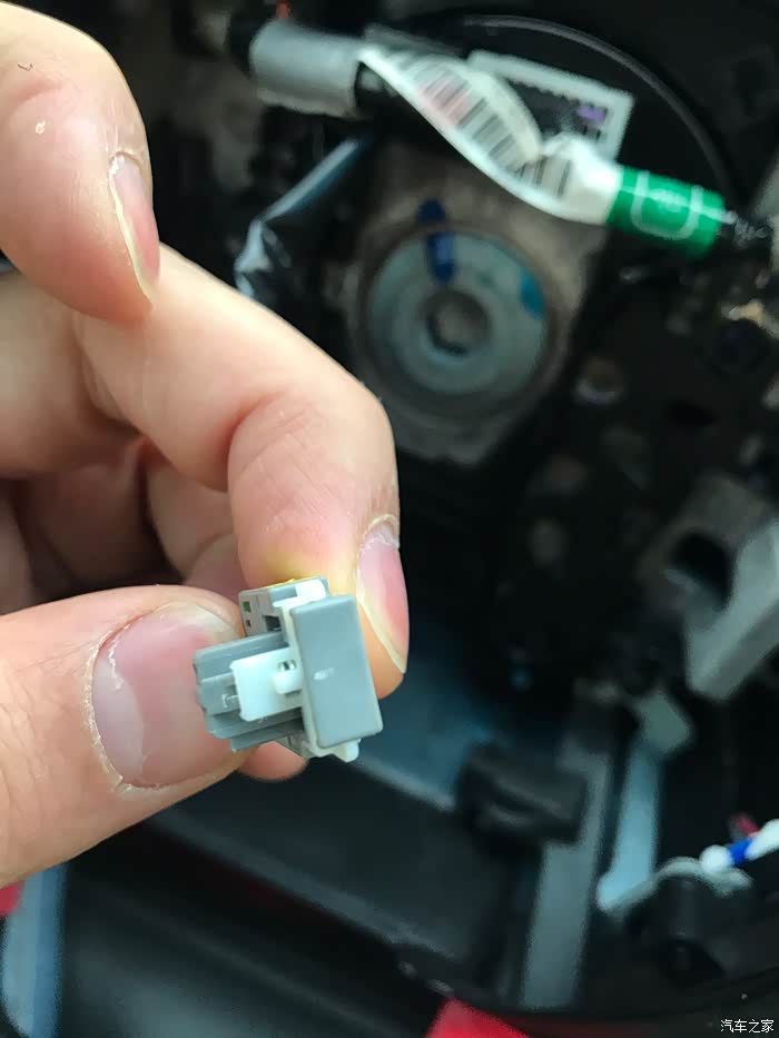 这是气囊插头,拆这个插头只需要把白色限位卡往外拨就可以拆开插头了!