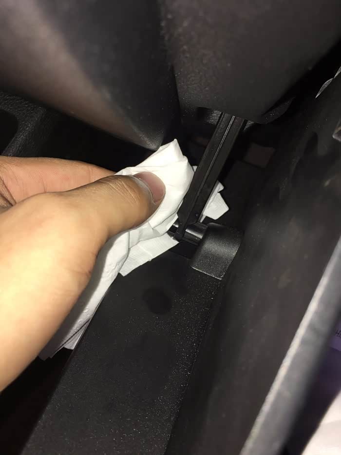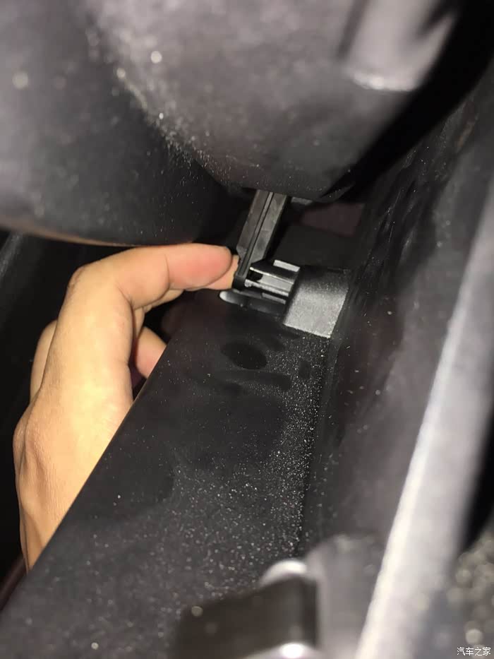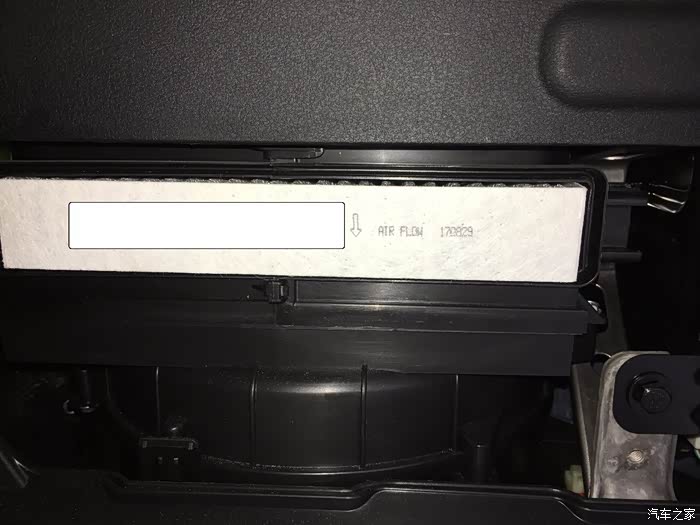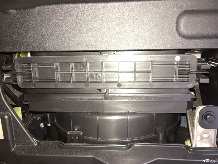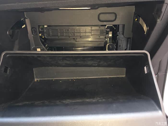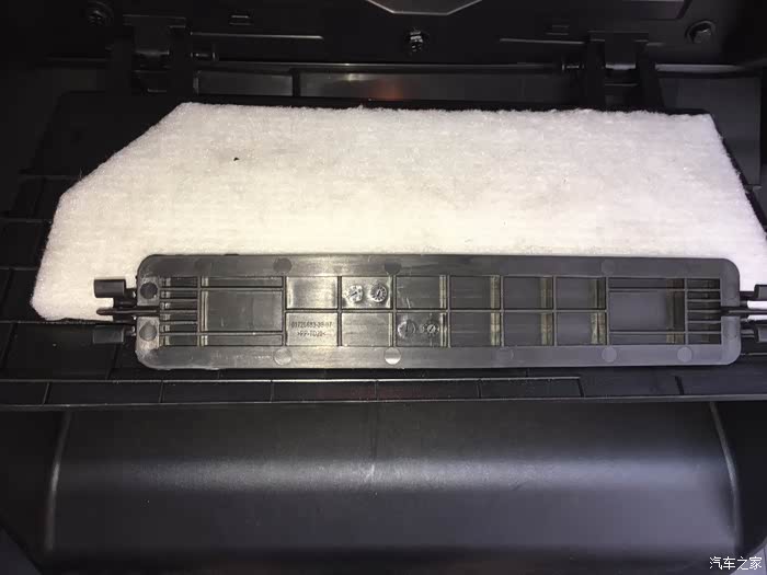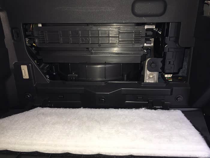 可以看到空气格盖板,还有一块厚厚的隔音海绵,细节上再赞一个,注意手套箱盖打开的弧度要太大以免导致中间转轴断裂,建议用脚托住盖板