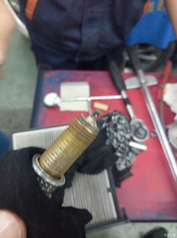 原车火花塞是博世的,看样子工况还是很不错喔,没什么黑色的碳物质,是不是能证明燃烧充分?拿出来的火花塞还这么漂亮是不是换早了啊?