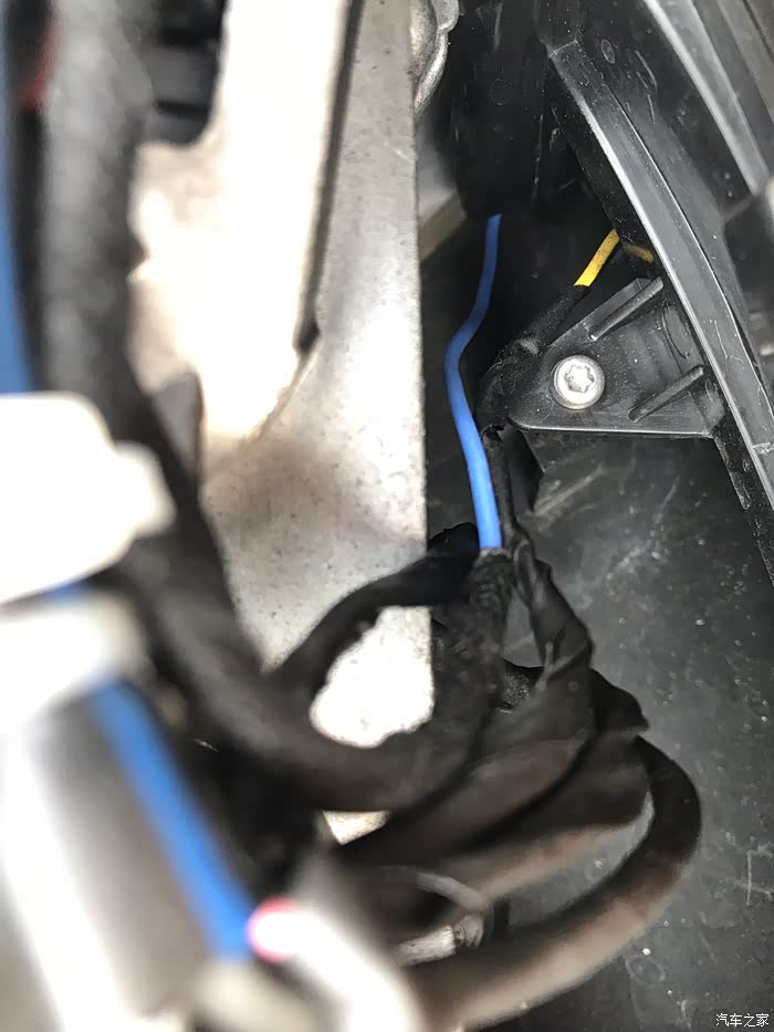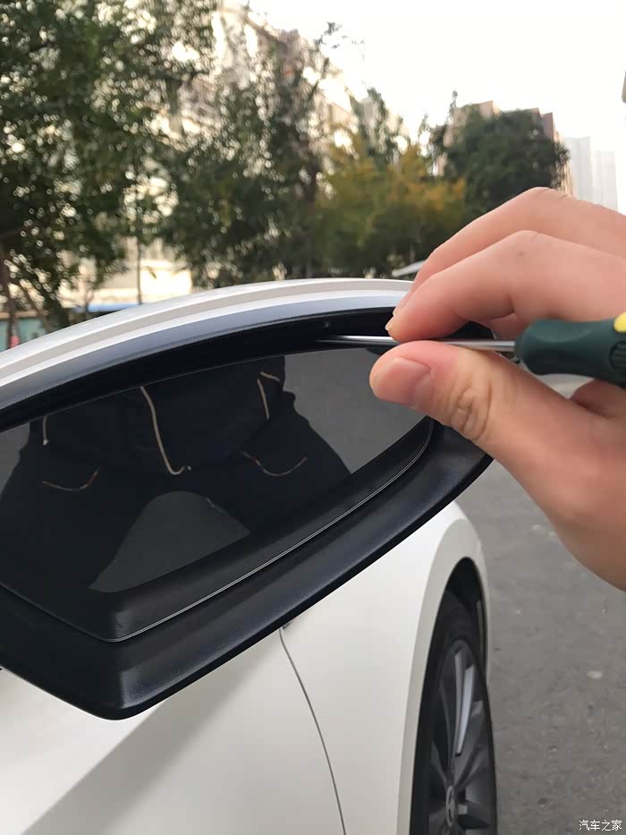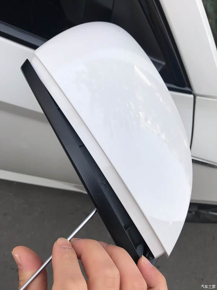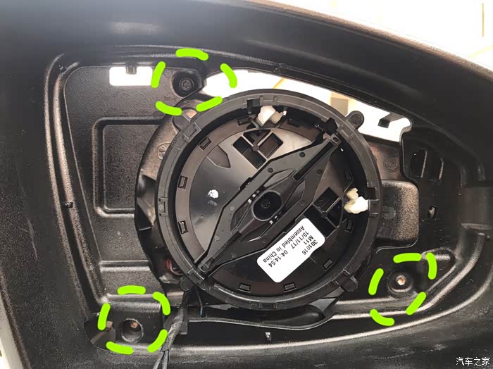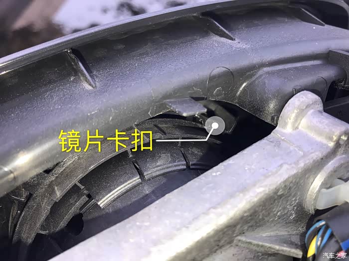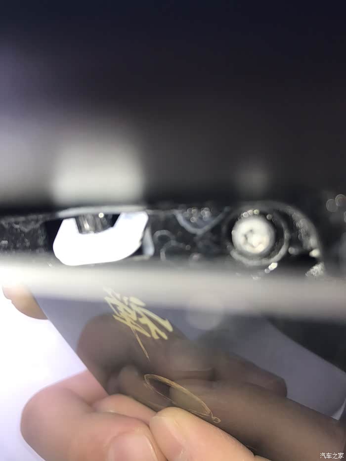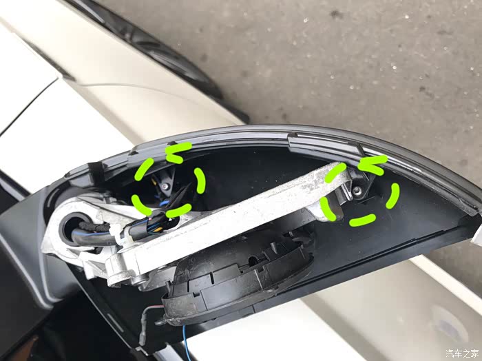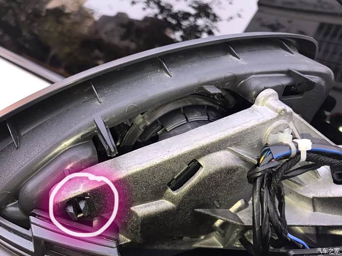 取掉镜壳咱们会看到两颗固定原车灯条的螺丝,其中一颗可以很直观的看到,另一颗就不行了,被塑料件给覆盖了!接着就行下一步!