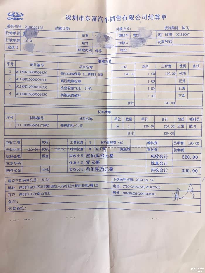 换了变速箱齿轮油,加上刷ACU和简单的检查,一个小时不到收费320元,还不能刷卡,只收现金
