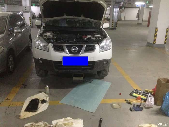 1、我家逍客10万公里了,CVT油一直没有换过,看过枫桥大师的帖子,自己购了NS-3cvt油两桶,滤芯1个,准备换油。工具准备好,拆左前轮胎,轮内护罩。两个千金顶,将车顶起,放好安全支架。拆除发动机护板,放油。放完油,拆油底壳M10小套筒。