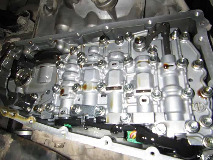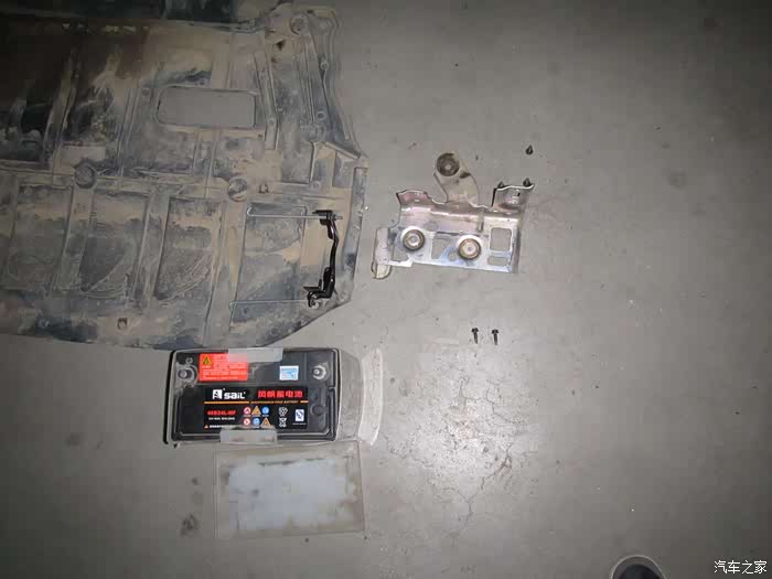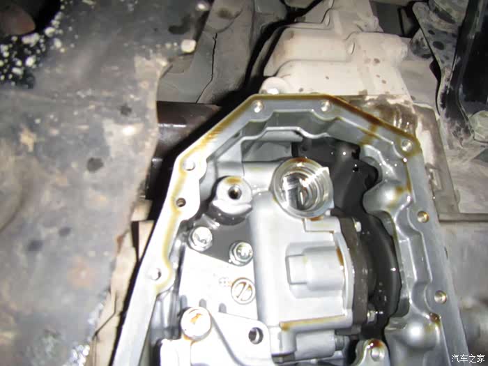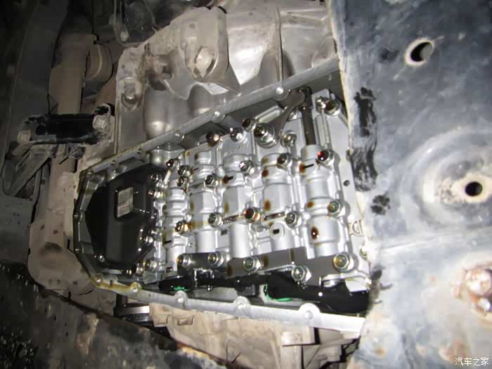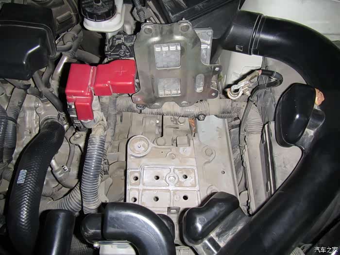 12、拆CVT电脑固定螺丝,用M13套筒。本想拆下电瓶底座,这东西用M16套筒,好不容易拆下,上部两个螺栓,下部还有,并且和发动机连接着,不好拆,放弃拆电瓶底座,直接拆CVT换热器,螺丝不大,用M10套筒,就是位置太窄,折腾了1个多小时,才拆下4个小螺丝。
