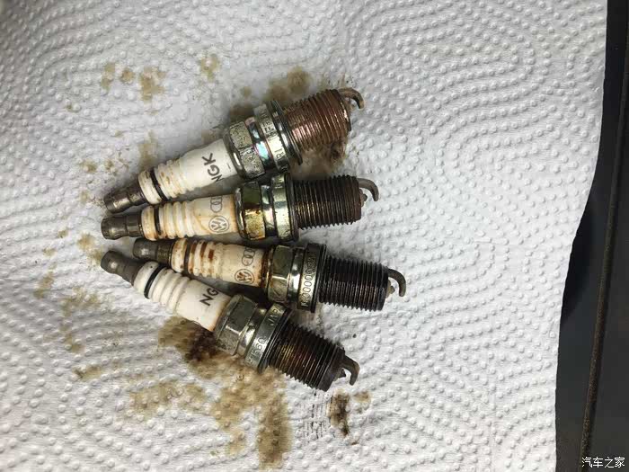 从上到下一次4.3.2.1缸火花塞。仔细看你会发现磨损跟油渍不一样,正常的应该是4缸也就是最上面的火花塞!应该是干的,而不是都是机油渍!!!