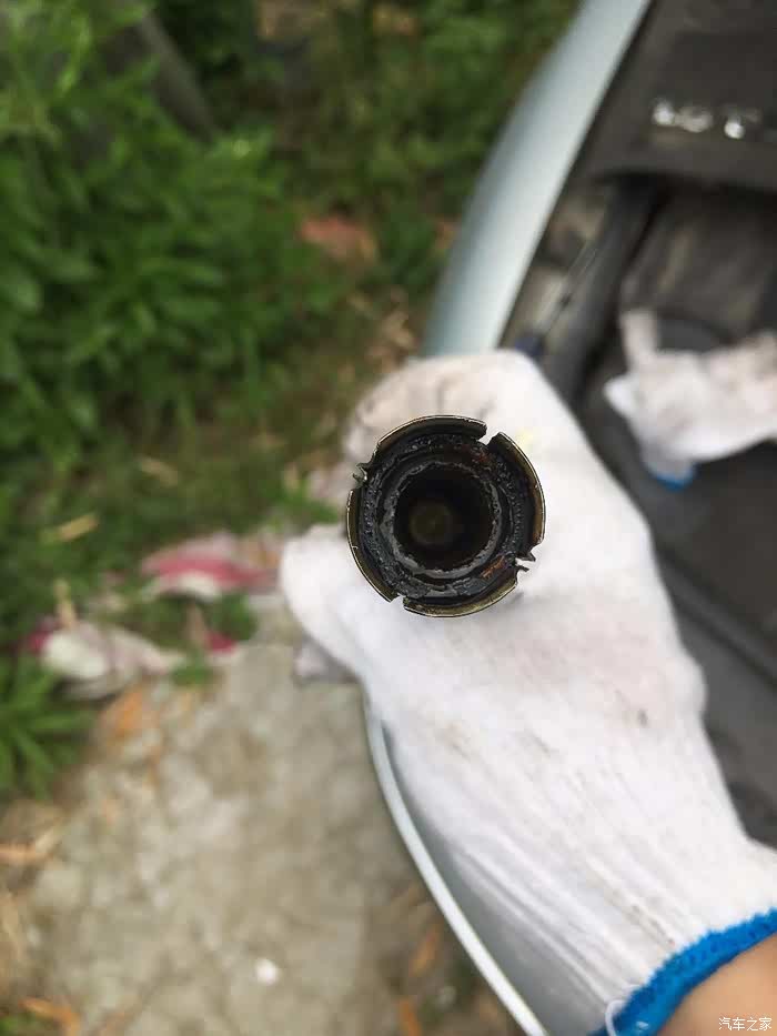 拆火花塞的时候,即便是专业的套筒(内置磁铁)也并不能把老的火花塞给取出,所以用换下来的高压线圈去把它夹出来,这个小窍门会很实用哟。取出的二缸火花塞磨损严重并且偏磨,都是机油,积炭