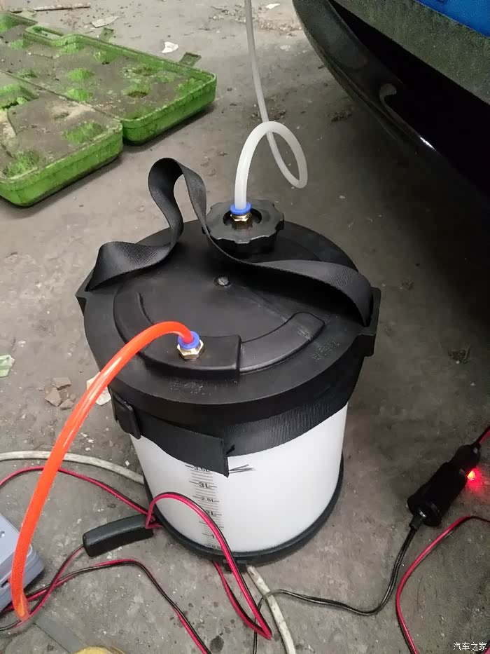 对了就是这里,应该要先抽这里的。抽的时候不停的补油到壶里面防止抽空,抽空就要排气,一个人无法进行。