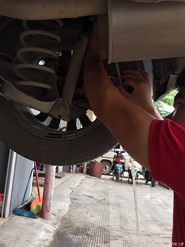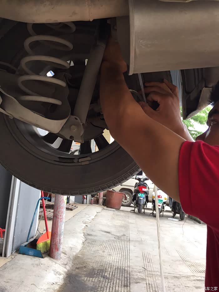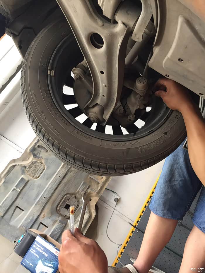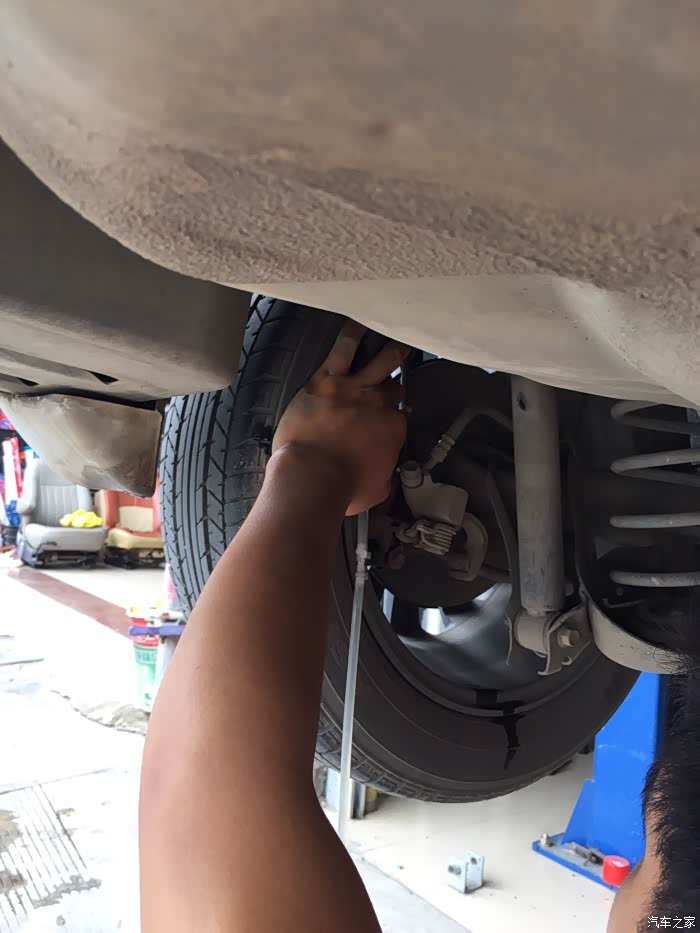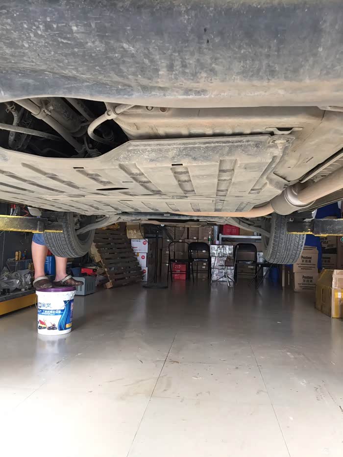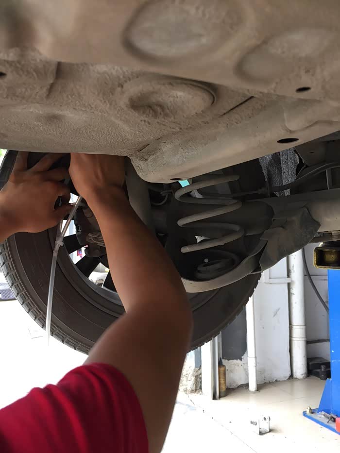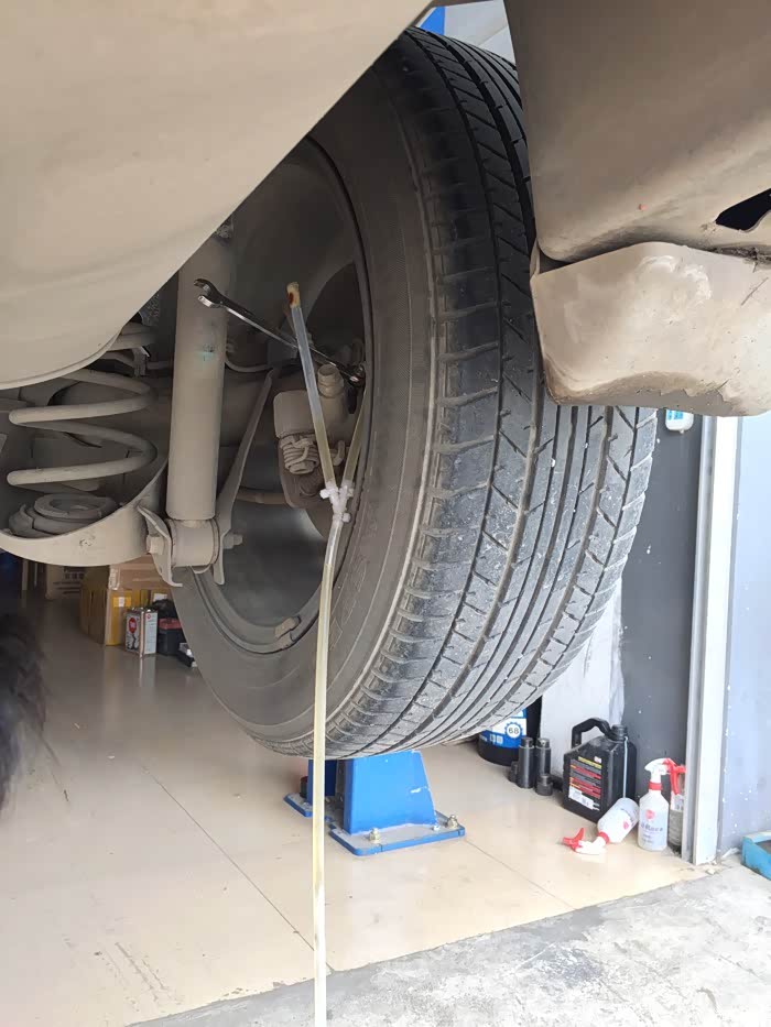 车底盘,看了下,没什么磕碰。老板在车头左前位置根据液面情况倒入新刹车油。