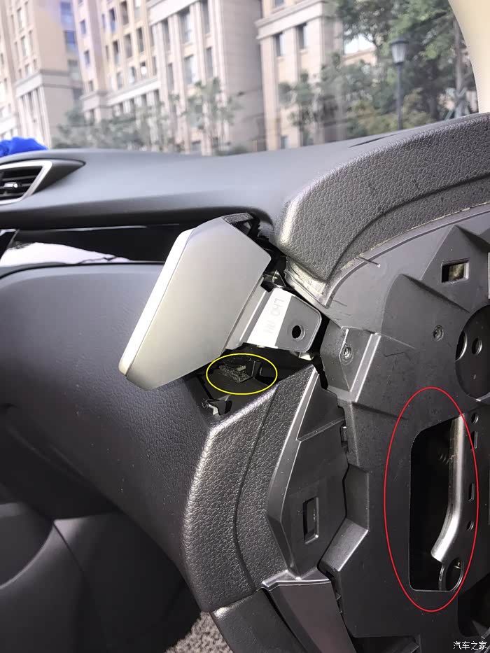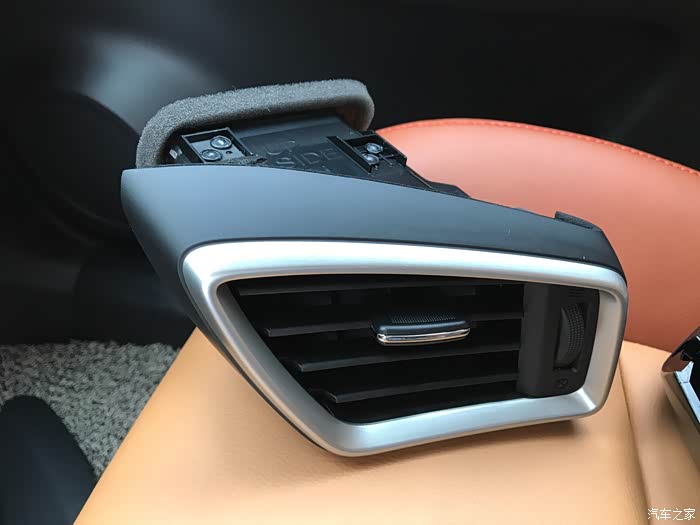 然后拉出空调出风口。这里要讲一下技巧,从红圈处手伸进去偿试扳黄色的卡子,出风口就比较容易拆下了。