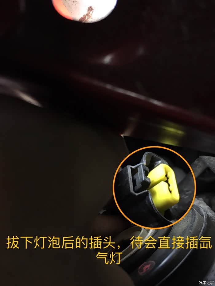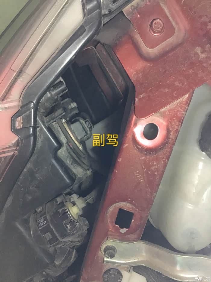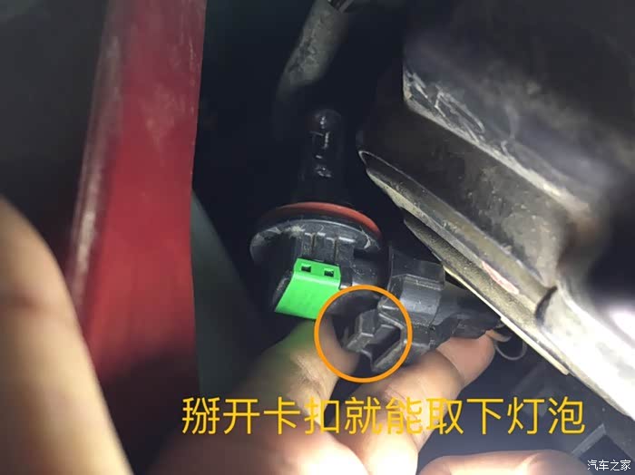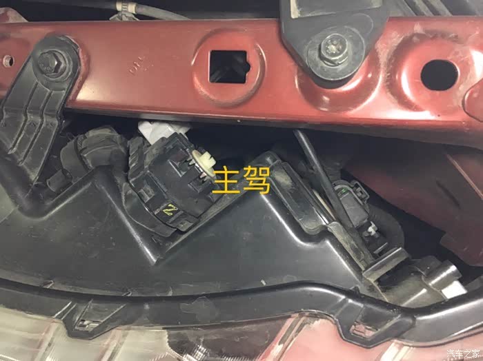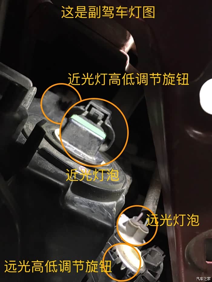 这是副驾侧图,近光灯是靠车身外的那支灯泡,靠内的是远光。把近光灯泡逆时针拧,听到咔嗒一声就能取出灯泡了。非常简单!