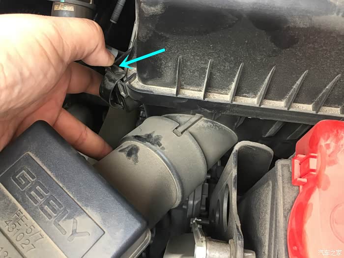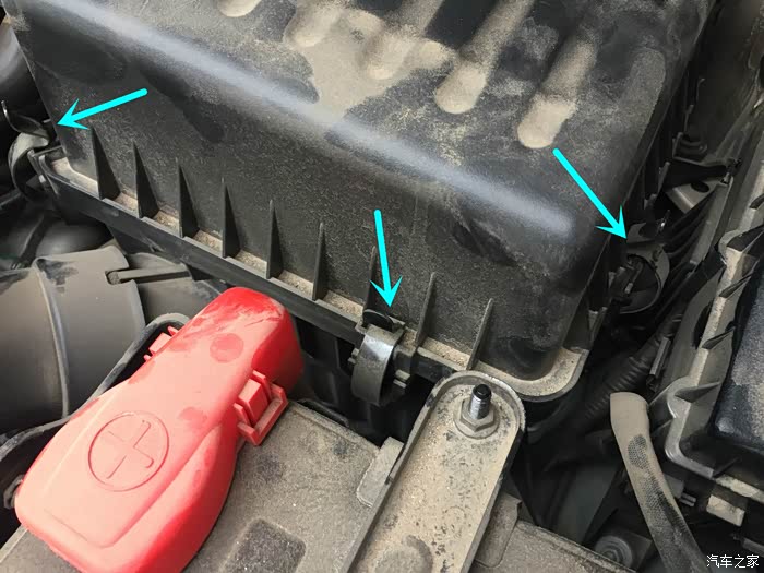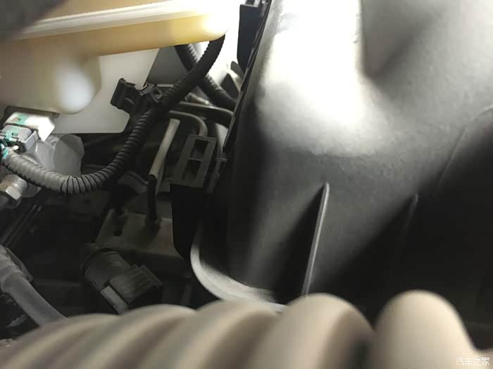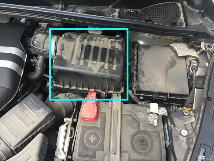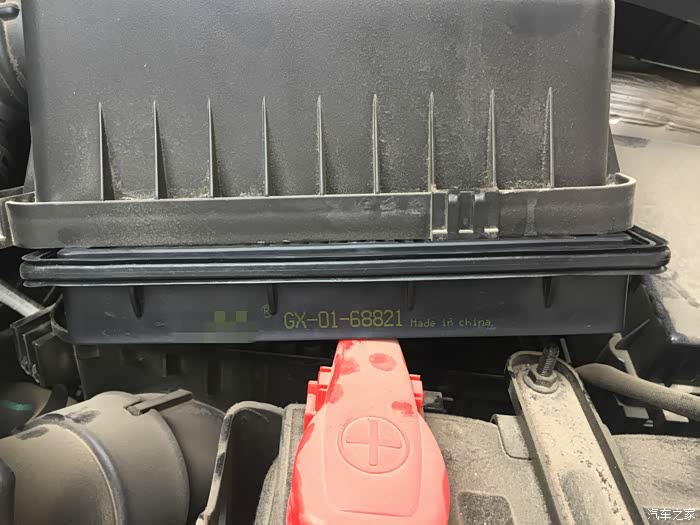 卸下这个仓开后,在发动机右边,电瓶的上面有个小黑盒!这个就是空气滤的家了!