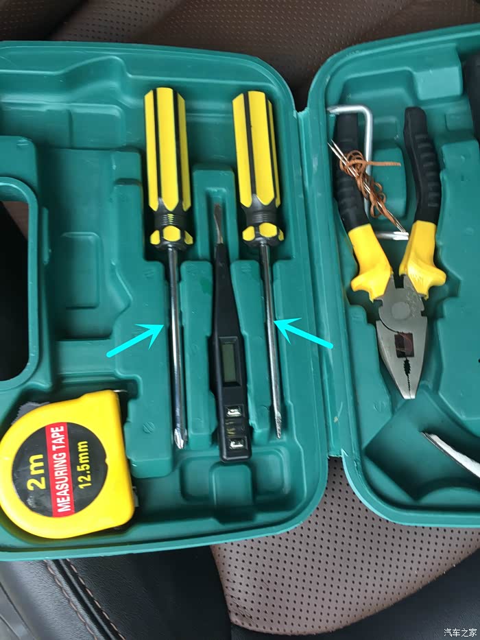 准备工具如图,习惯了车里备一套工具,其实换空气滤只用到两样,一字螺丝刀和十字螺丝刀。