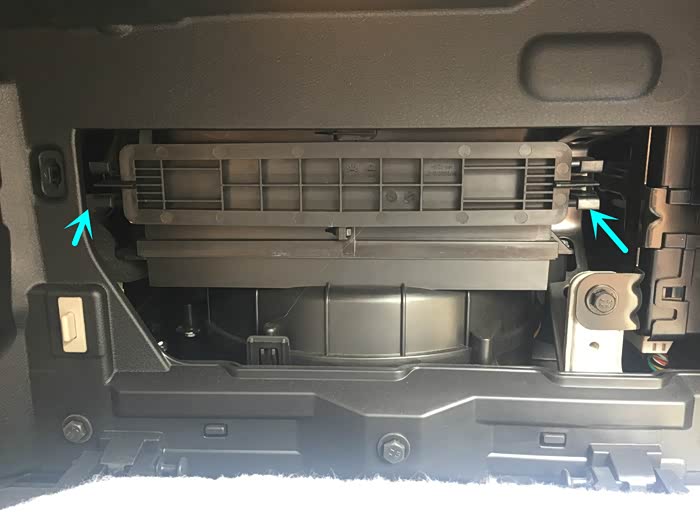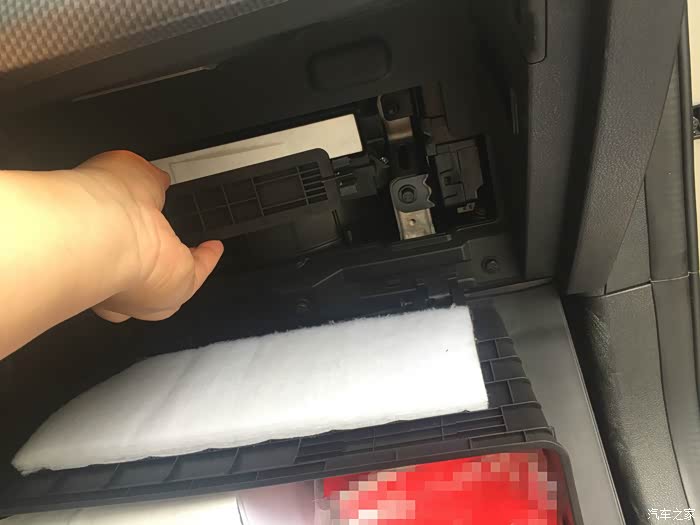 我们把储物箱全完打开后,能看到个黑色长方形的挡板,这里就是空调滤芯的小窝了!将两侧的卡扣上下一捏就可以把它拿下来了!
