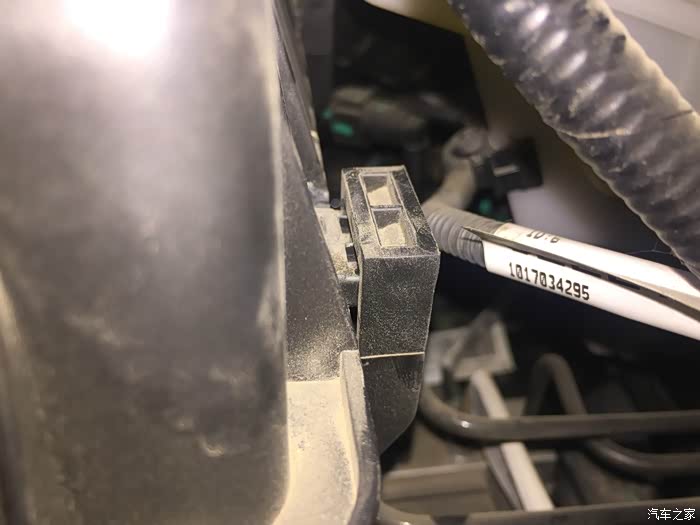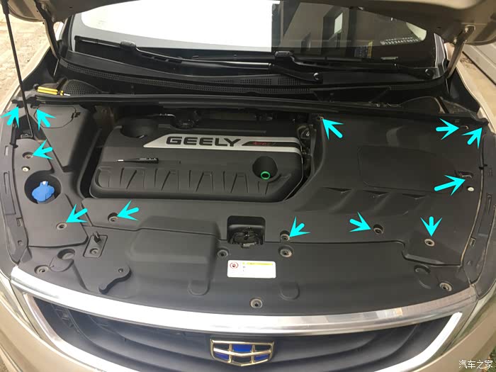 打开发动机机盖,怎么打开我想大家应该都知道吧!直接上发动机舱图,图中标记的是固定卡扣的位置,把卡扣用一字螺丝刀一翘就可以拿下来了