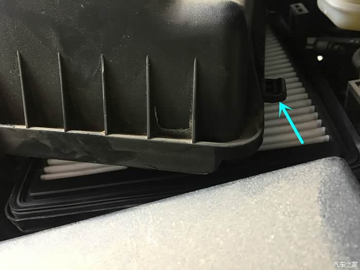 将3个卡扣都掰开,将小黑盒的盖子往车头的方向挪开,往上轻轻一掀,这里可不要太使劲,能把空气滤芯拿出来即可!这个我原车上的空气滤芯是不是很脏!