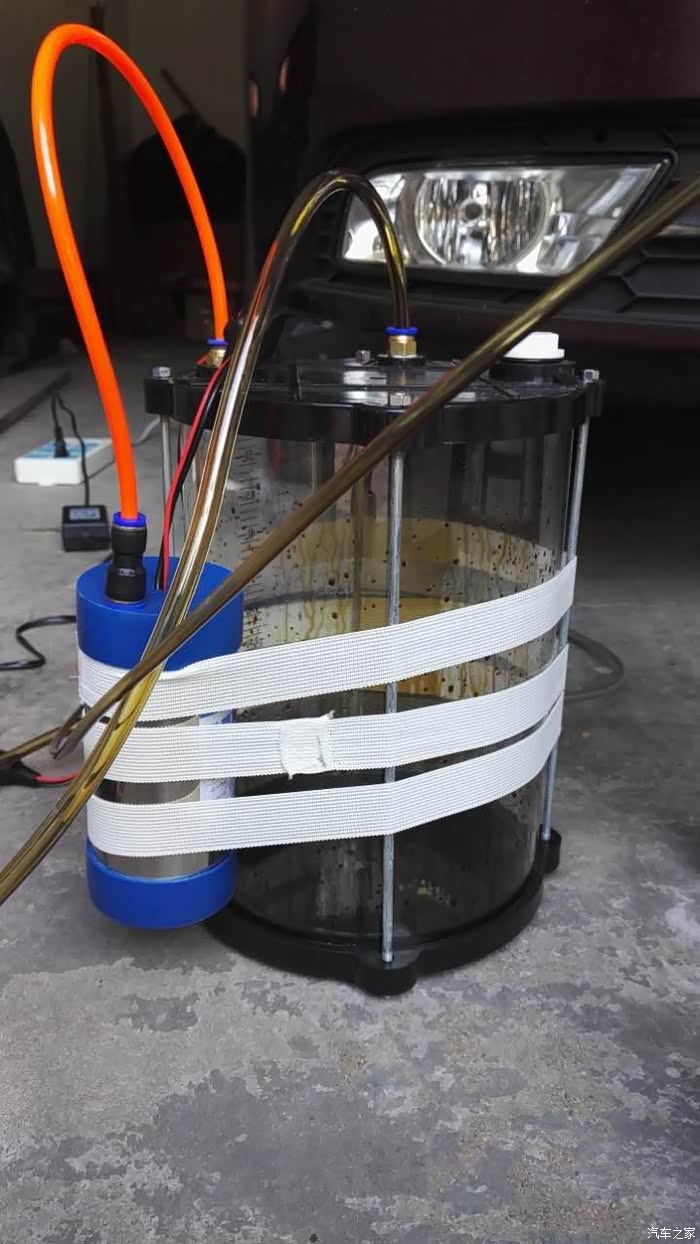 这里重点介绍下,自己换油的神器,电动自助吸油泵。如下图所示,一个电动泵,加上一个密封罐,还有几个管子,组合在一起就成了电动自助吸油泵。可以用车载电源,也可以直接插转换器用交流电。我怕损坏电瓶,所以就直接连的交流电。吸力很大,我用水做了测试,300ml的水,10秒左右就能吸完。现在用了3次,吸力稍微下降了些,不是泵的原因,是机油太滑了,把管子的链接处都润滑了。。。