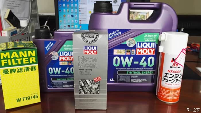 主要配件合照,力魔机油0W-40一个大的4L装加一个小的1L装,后来的经验告诉我,买少了。还有力魔发动机内部强效清洁剂1019,大风节气门清洗剂(这个是我单独清洗的暂时先不发作业了),曼牌的机油滤芯。