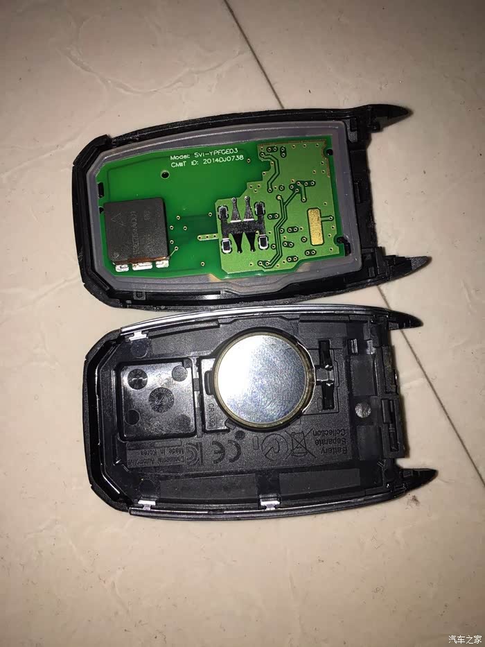 钥匙打开了,智能卡是一部分,电池是另外一部分。不知道咱这钥匙的智能卡发射频率是多少,有知道的车友可以告知一下。
