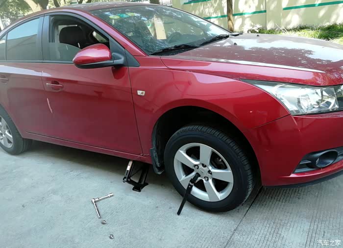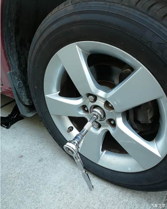 那就下次再说吧。出了4S,回到家,网上搜了一下,前轮轴承只要150元,马蛋,4S也太黑了吧。趁着国庆假期,到汽配城买了一个前轮轴承头,然后开到公司(公司工具比较全),接下来就是更换过程(由于国庆假期,公司无人上班,自己干活,自己拍照):一、熄火,拉好手刹,拆松轮胎5个紧固螺丝,拆下轮胎中间主轴螺母(好像是32的套筒),用千斤顶顶起汽车,拆下轮胎。