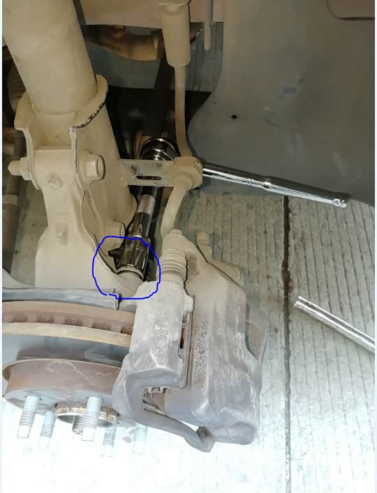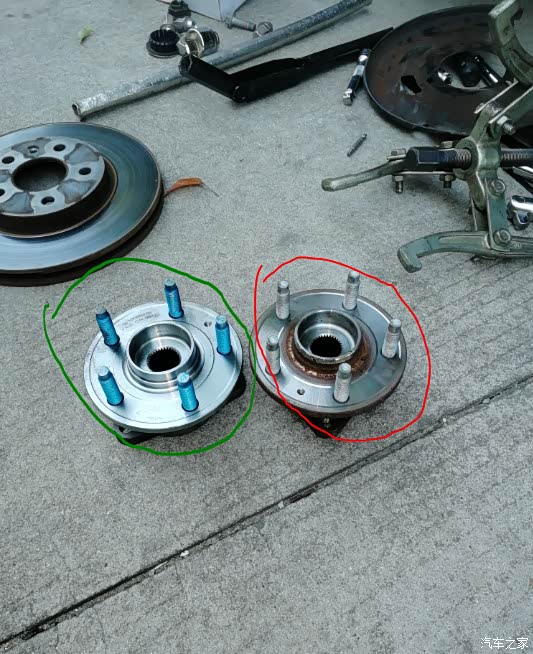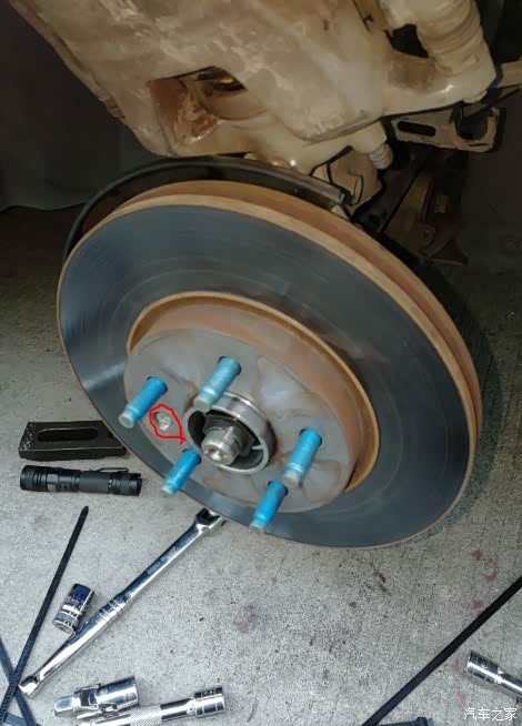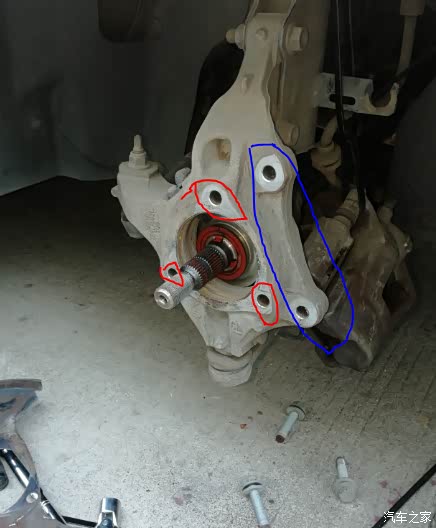 二、拆下刹车的2根紧固螺丝,18的套筒,见图4,下面还有一根螺丝,共2根。(图5是拆卸好后图片,蓝色框是安装刹车钳的螺栓孔,红色三个是安装轴承头的螺栓孔)。2根刹车钳螺栓拆卸后,刹车钳怎么也拿不出来(不能与刹车盘脱开,刹车钳开口小),在汽车之家论坛一搜,谢谢前辈的贡献,这边没有图片,不过很简单,用一字螺丝刀插到刹车盘与内侧刹车片之间掰,刹车钳就会松开了,轻松取下,用扎带绑住,不妨碍干活就好。