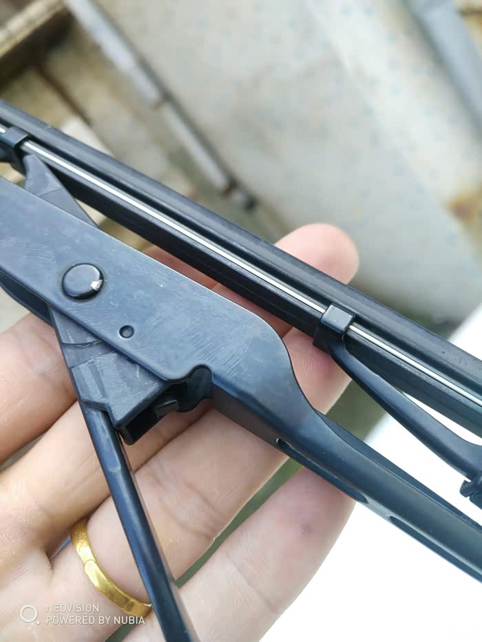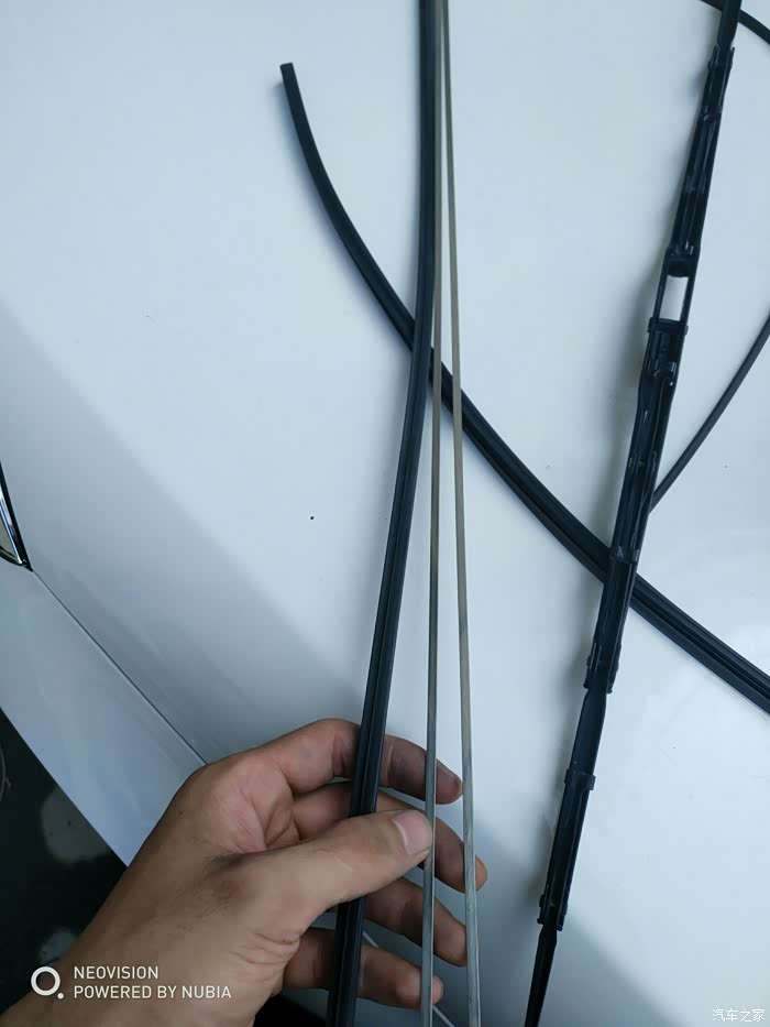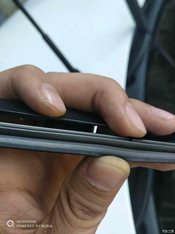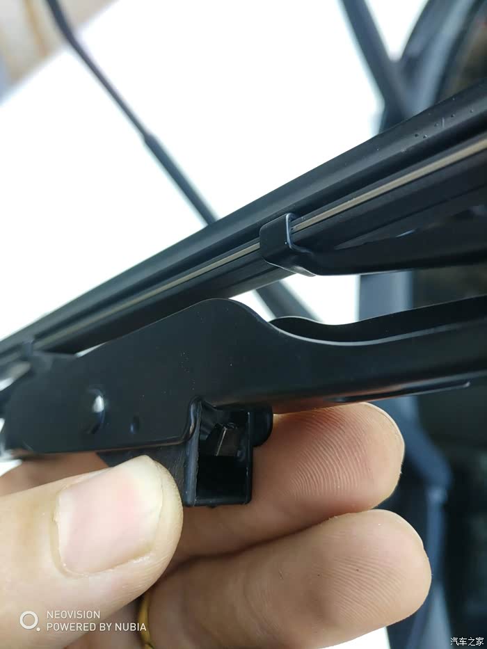 卸胶条,因为是有骨雨刷,更换相对麻烦些,不过熟练了一样。先把雨刷提起来,找一找雨刷上的小卡子。