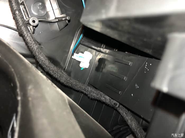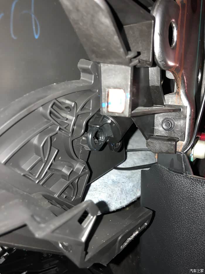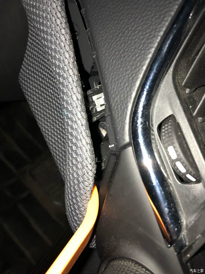 中控面板下面的保险丝盖板,有个手挖的孔洞,可以把行车记录仪的线从里面穿过来,中控倒车影像模块的urb插口也可以这里伸出来,接上延长线,从中央通道侧面的饰板连接到后排,当作后排充电接