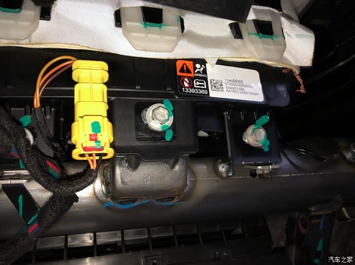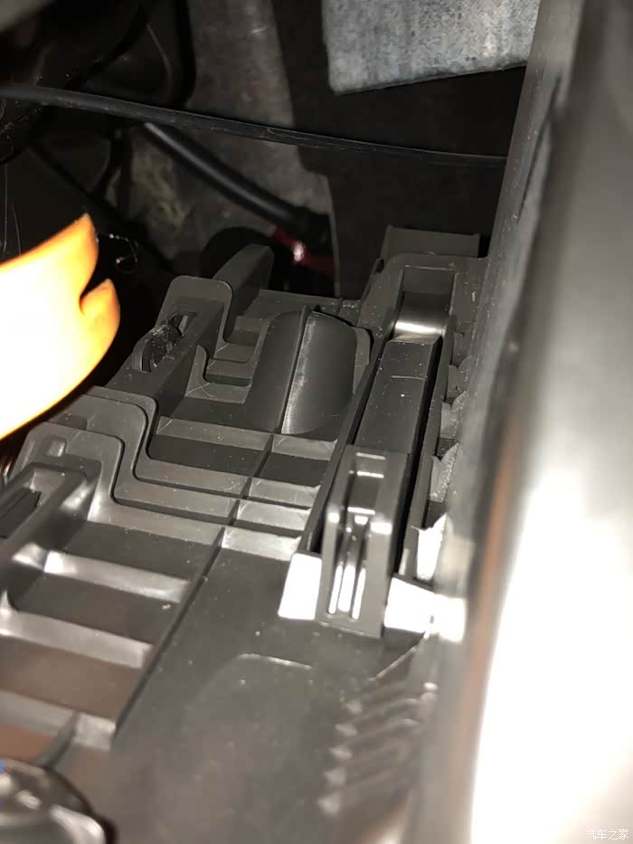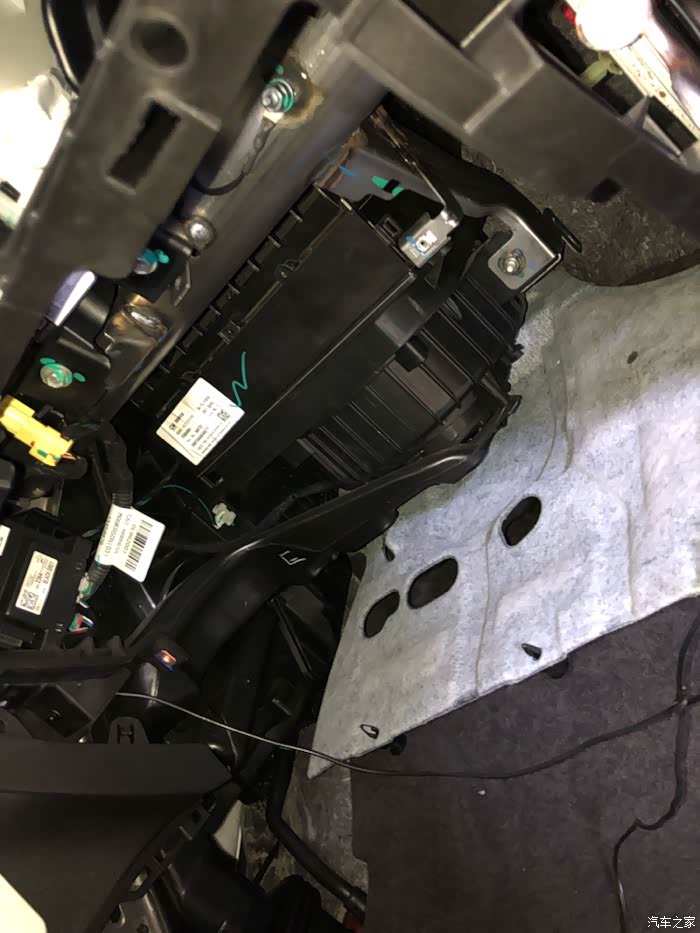 副驾驶手套箱下面的隔音棉面板和空调吹脚下的风管,黄色的是安全气囊插口