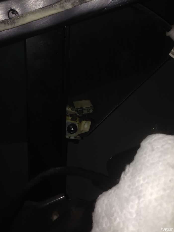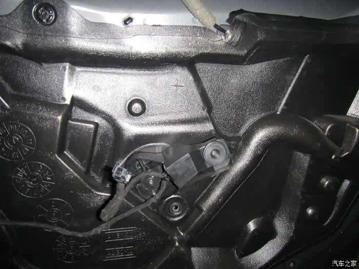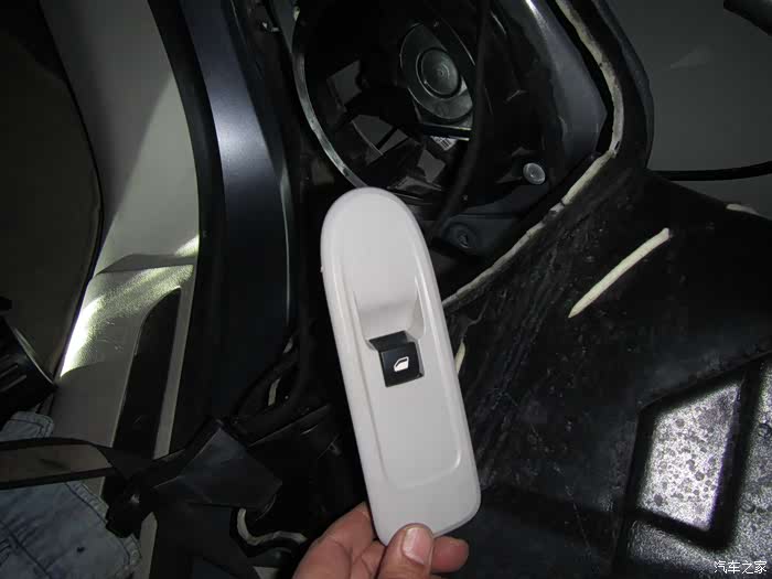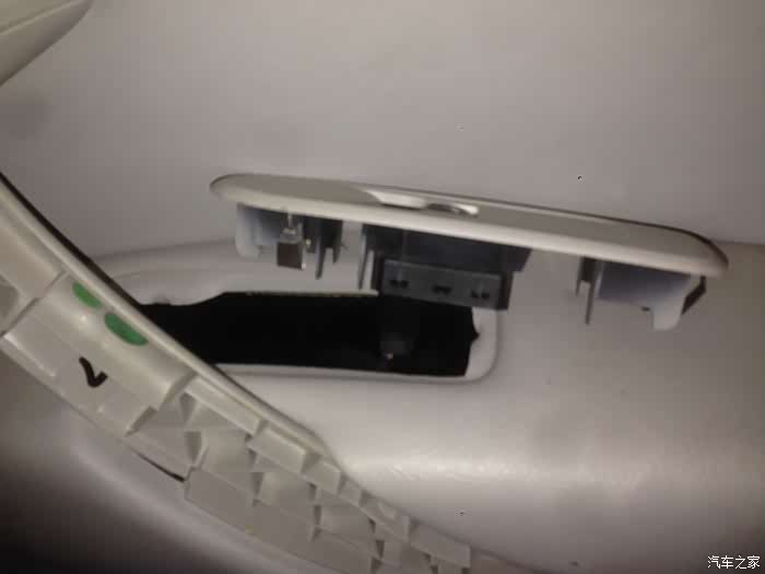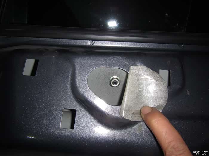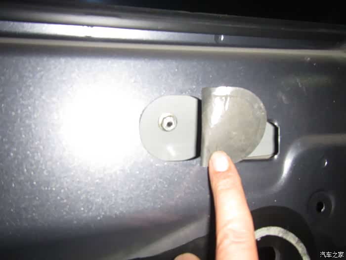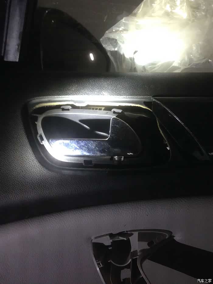 4、拉开门内饰板,从下部左下角下手,由于较劲,拉坏内饰板卡扣5个,更换新的。取下门灯。