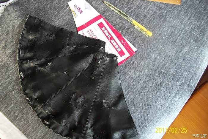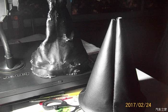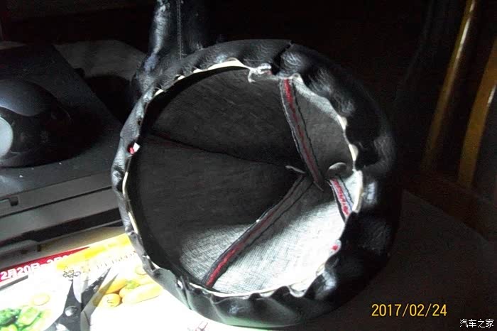 自去年车买回就发现档把套表面已经斑痕累累,稍加处理用到现在。节后闲暇无事,想彻底的解决一下。淘宝一大把,但是近期见车友发帖,受其中“爱版用爱人长统靴自己换”的启示,于是也萌发了自己制作更换档把套。说干就干,在隔壁邻居家丢弃的老板椅垫上获取仿革皮一块,取样、栽剪、缝制,安装完成,自我感觉不错!