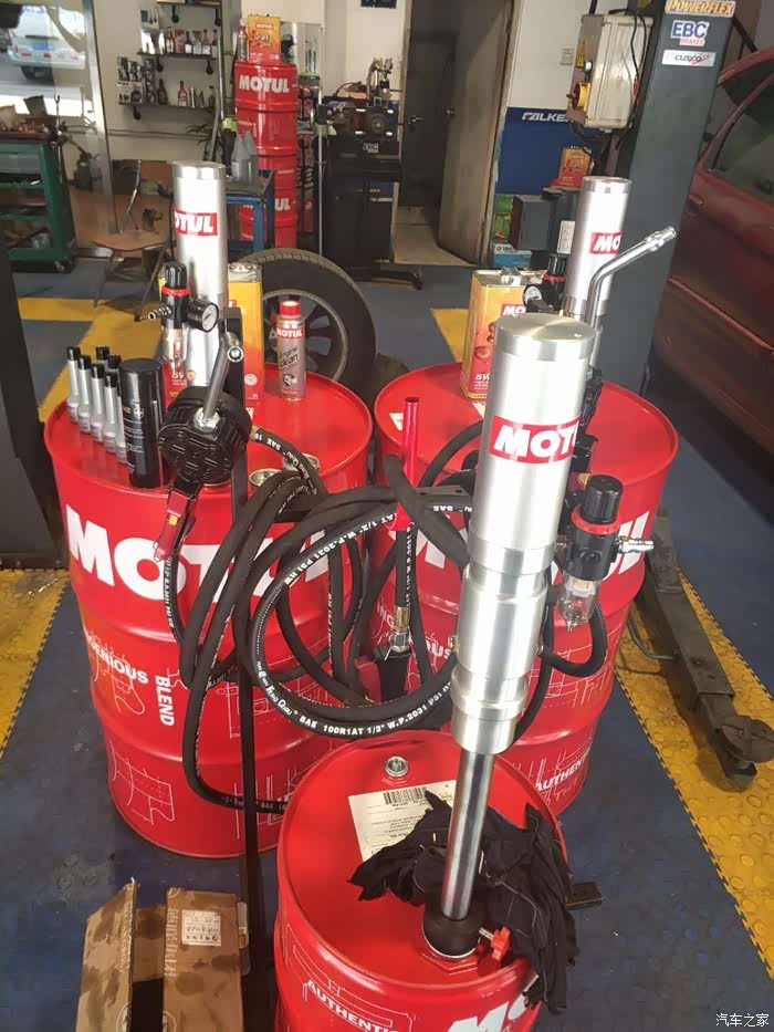 他家保养得用的大桶摩特,不是放油而是抽油出来,然后加进去,用多少加多少。我看见有5w30和5w40两款。也有铁桶的好高大上。
