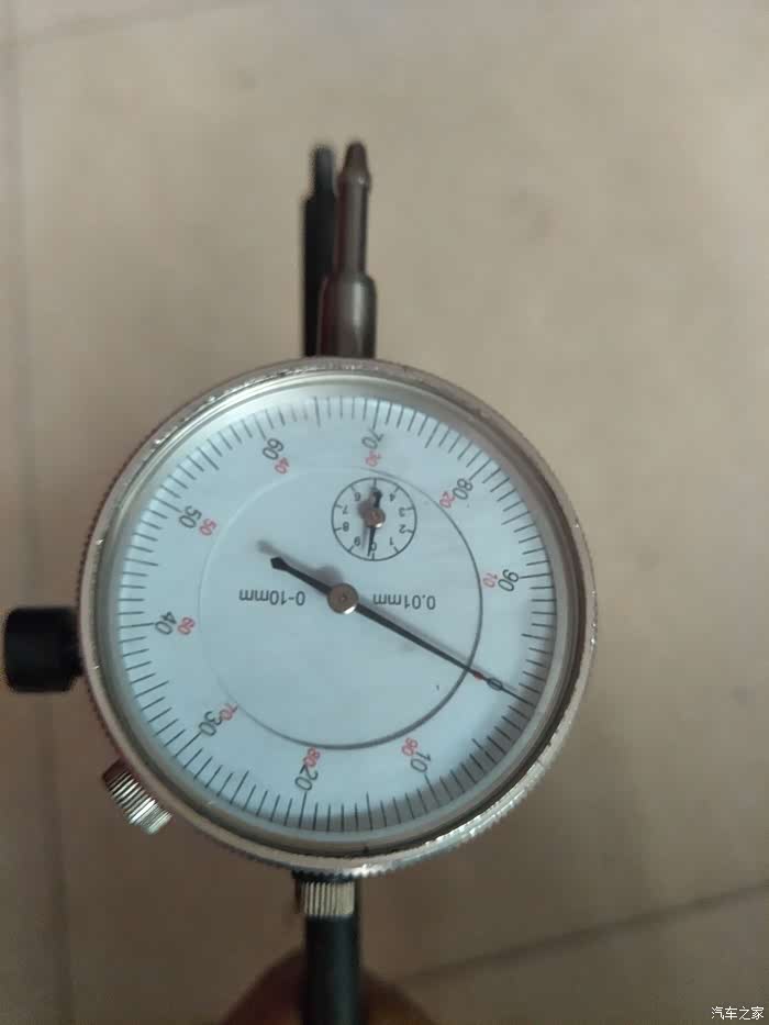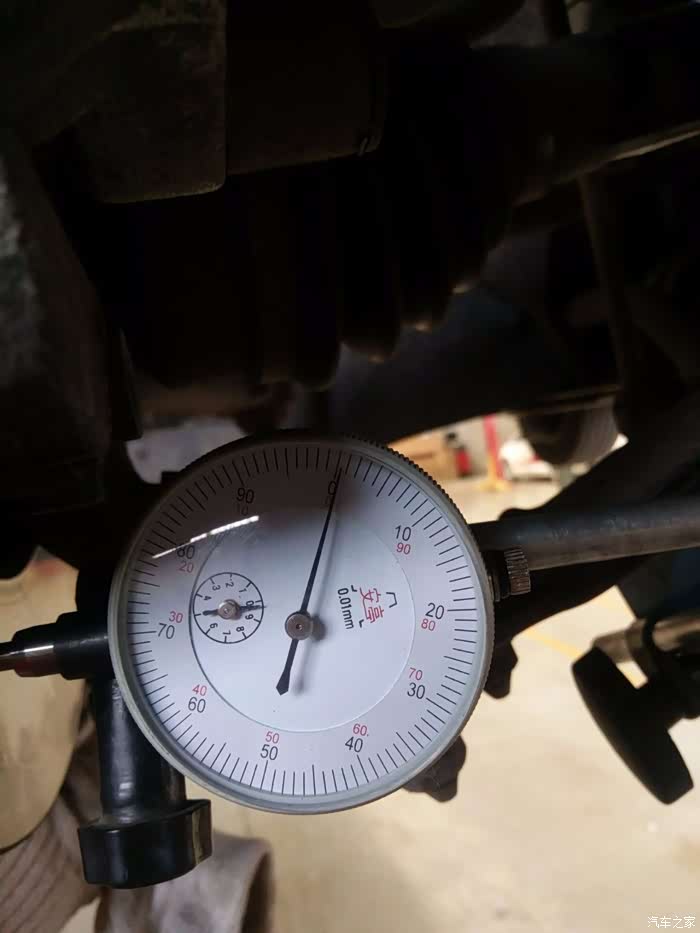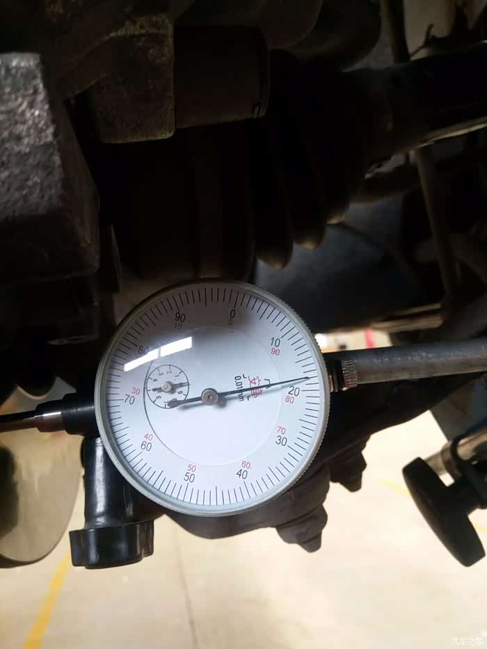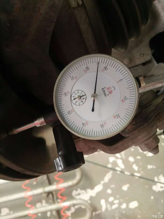车辆行驶40码左右时踩刹车方向盘发抖,80码左右时更为严重,踩刹车方向发抖可能出现问题的部件有,1-刹车片变形或偏磨,制动卡钳变形,2-刹车片变形,3-传动轴变形4-轮胎钢圈变形5-底盘胶套或螺丝松动,这些都是行驶时踩刹车方向发抖的原因件或可疑区域,需要逐个的来检查和排除,说实在的我车子是开的比较细心的基本是没有事故和碰撞,师傅检查了底盘没有发现有明显变形的部件。首先对轮胎,刹车片和正常车的做了移植,试车发现还是发抖,这就排除了刹车片,轮胎的问题,看刹车盘表面磨损也不是太严重,也看不出有变形的现象,技术经理过来说只能用专用工具测量制动盘跳动量,经过测量右侧0-0.18mm左侧0-0.14mm测量的数据明显大于参考数据0.05mm.问题就在刹车盘这里,在以前刹车盘是可以在车床上找平的,现在基本都是更换了,更换两个新刹车盘后试车故障完全排除了。此次维修正真体现了4S 店的专业性。专用工具,专业数据这都是4S店才具备的,这样我们修车也放心,省心。