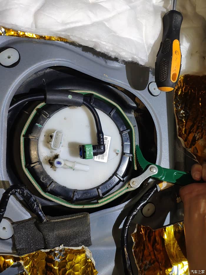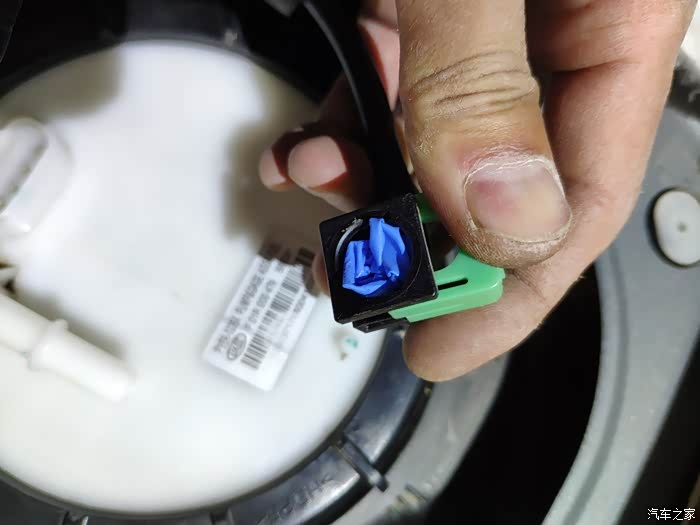 第一步,把四芯插头拔掉,两条电缆给油泵电机供电,另外两条电缆是油位感应的。