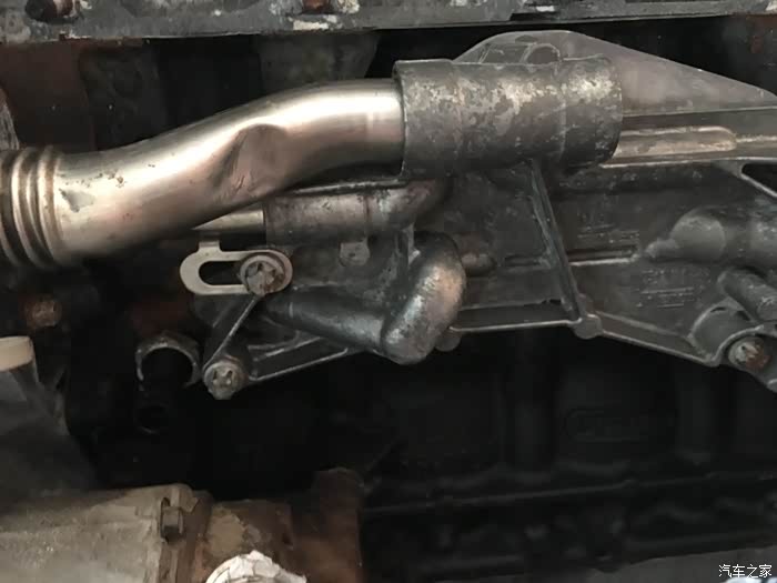 从图片可以看到,打码的兄弟吧我管给弄变型了,对我这样的强迫症患者来说,绝对不允许这样的发动机存在。于是,换了一个GM原厂的机油散热器