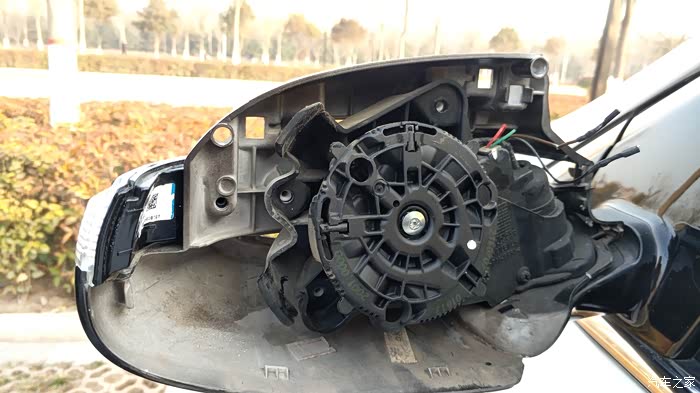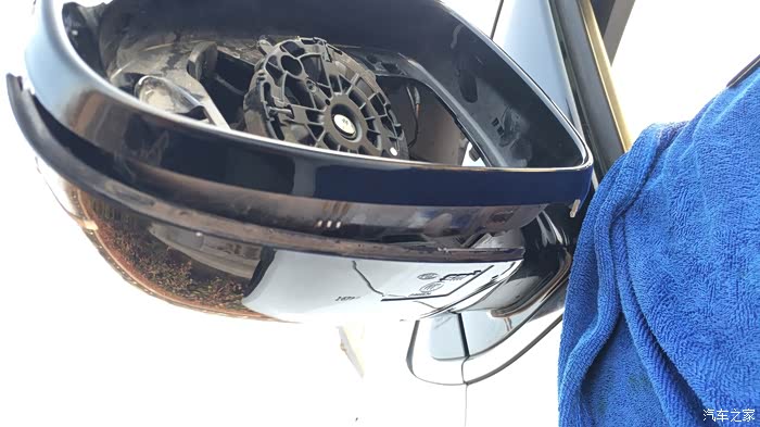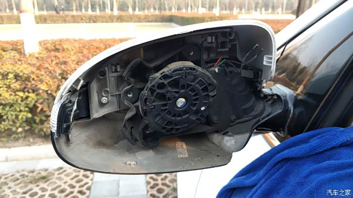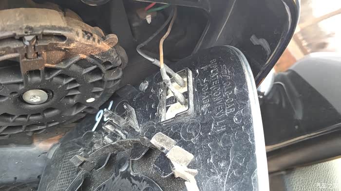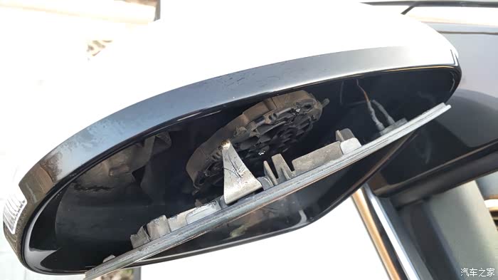 首先把后视镜调到最低,然后向内调一点,用毛巾护住塑料壳,用螺丝刀插进去使劲捅下图这个铁片中央部位,边捅边向外挑,配合另一只手向外掰镜子,稍微用力镜子就下来了,手残的和动手能力差的朋友就不要尝试了,不要问我为什么,车友寄过来的总成就被我拆坏了,还好我的没坏!