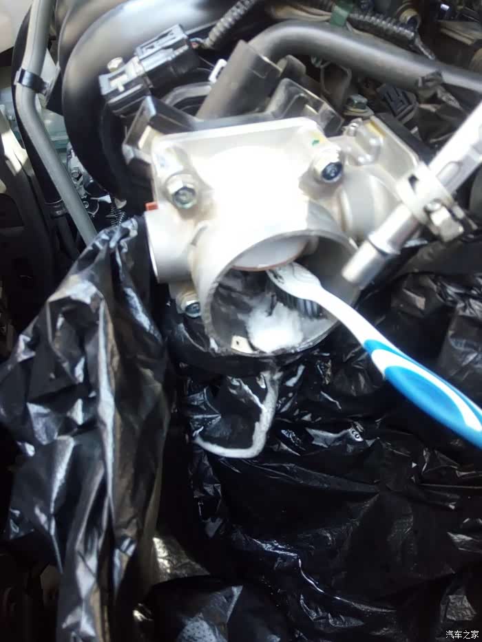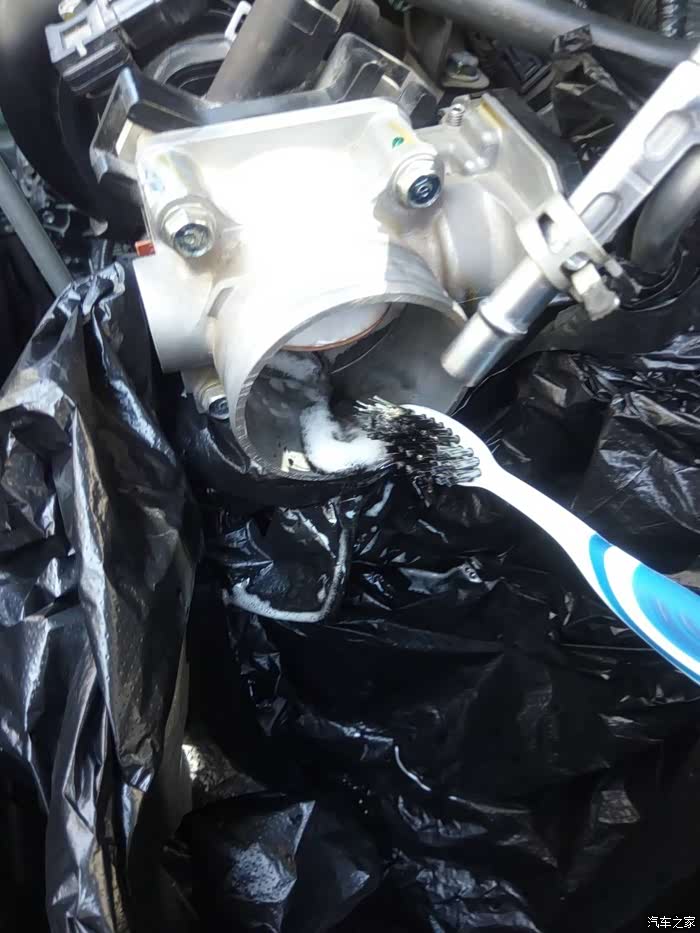 节气门通常是闭合的,为了清洗最好找个帮手,把发动机钥匙打开不要发动汽车,钥匙通电后让助手帮你踩下油门,这个时候节气门的碟片就可以完全打开,这样你就可以使用牙刷配合清洗剂来进行深度清洗了