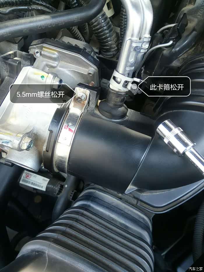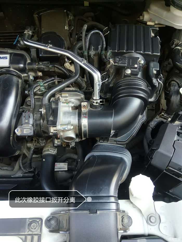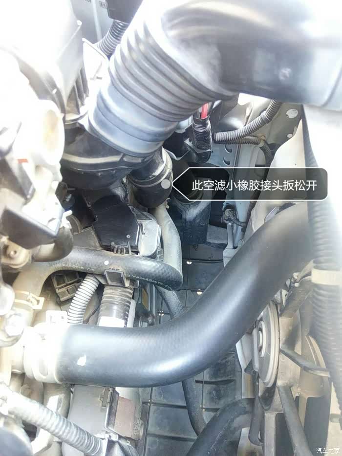三、拆除空气滤清器进气橡胶管:此处有2个橡胶连接管,上方为大方口,下方为小圆口