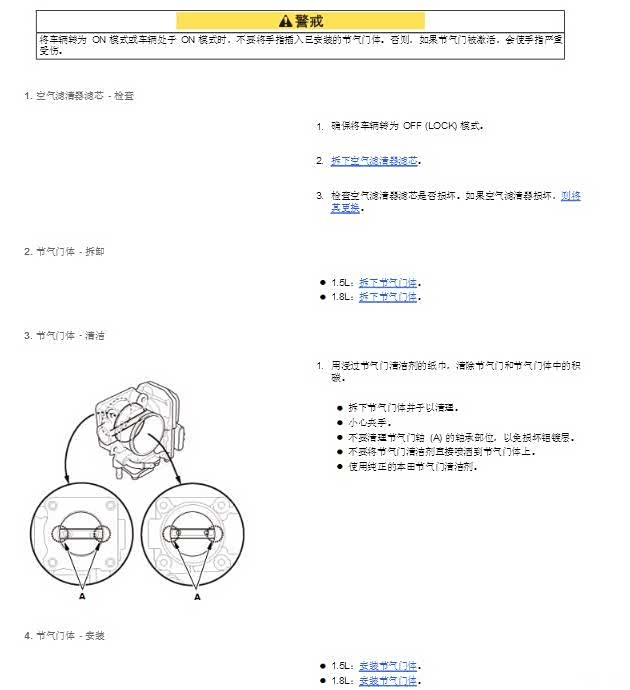 官方节气门清洗保养方法:1、空气滤清芯检查;2、节气门拆除;3、节气门清洁;4、节气门安装;5、节气门匹配复位