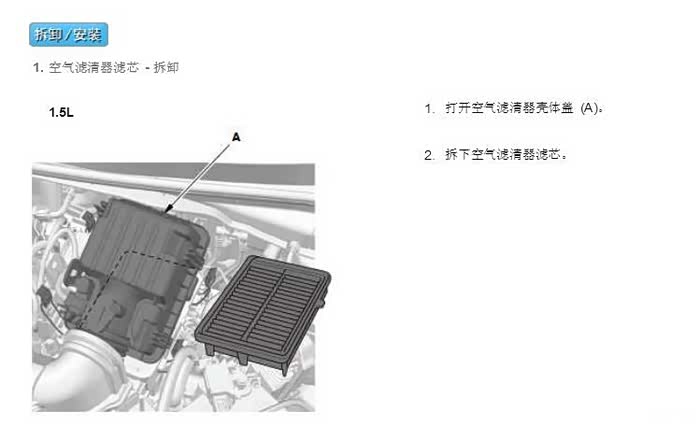 官方拆卸步骤,先拆下空气滤清器,上面空气流量的线束请注意不要拔下,不然汽车会显示故障码