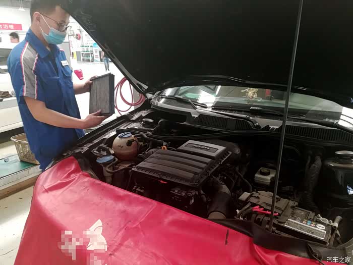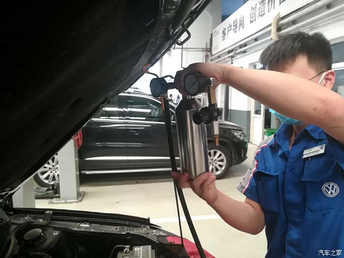 机油加注完成后师傅又对车辆的空调、空气滤用压缩空气进行了清洁与恢复。