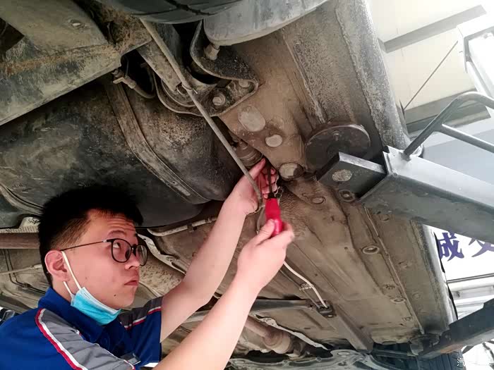 装好机滤拧紧放油螺栓,师傅拿起了发动机护板进行了固定,至此车辆下部的保养工作宣告完成。