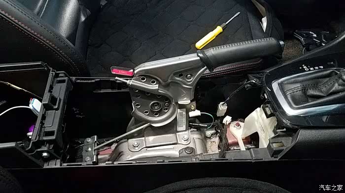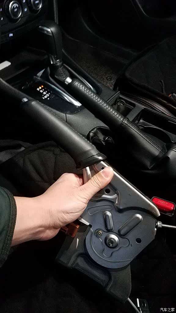 手刹部分的样子,不得不说阿特兹的大手刹设计很好!钢丝绳粗壮!与档杆设计位置又近!能怎么玩大家懂得。当年没犹豫17款电子刹。