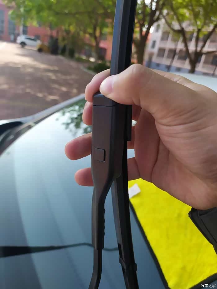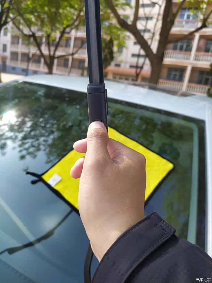 朗逸的雨刷不是那种U型的,还是比较好换的。按住图中的方形按扣,然后向上拔动雨刷器就可以将雨刷器拆卸下来了。