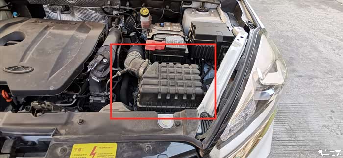 瑞虎8的发动机空气滤清器就安装在上图的红框中的盒子里面。
