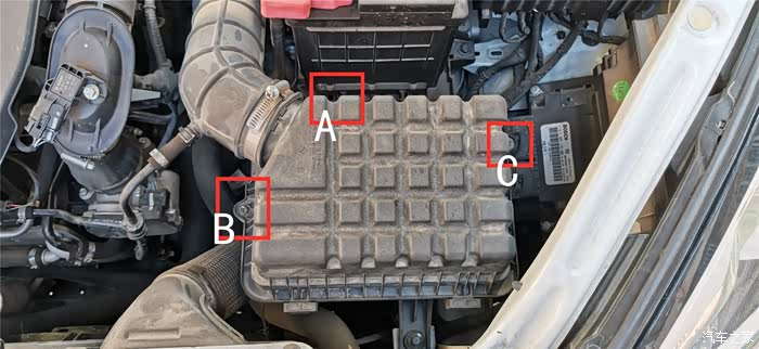 然后把之前拆下的A/B/C三个空气滤清器外壳的固定螺丝拧上去拧紧。