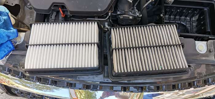 新旧空气滤清器的对比,左边是全新的,右边是用了20074公里的原车空气滤清器。